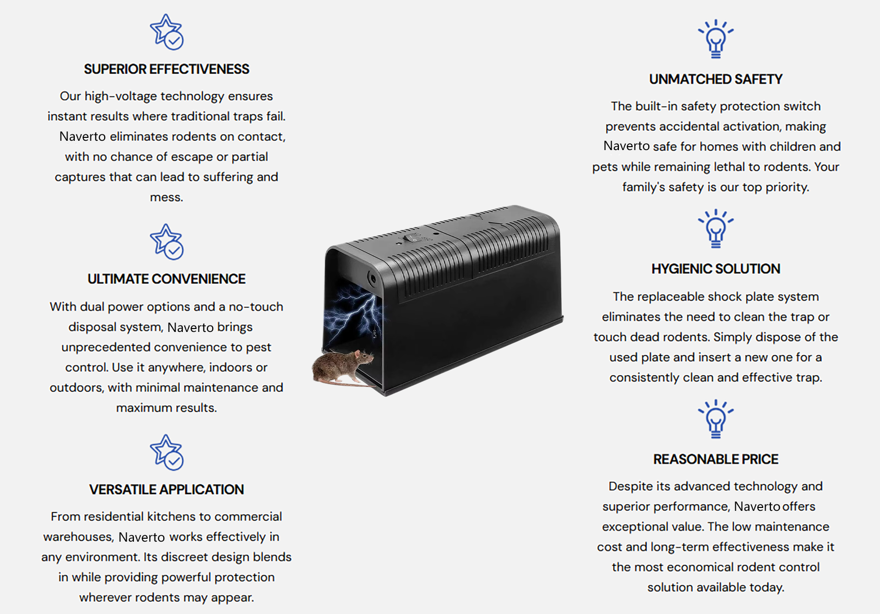 Naverto uses high-voltage electric shock to eliminate rodents instantly when they make contact with the electric plates.