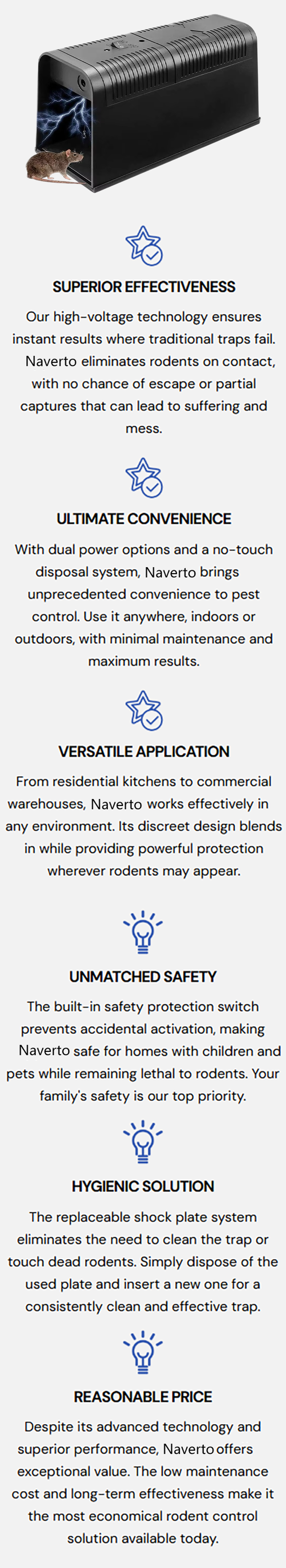 Naverto uses high-voltage technology to eliminate rodents instantly and effectively. Unlike conventional traps that often fail or require perfect placement, our electric trap guarantees results with its advanced design, ending the frustrating cycle of checking empty traps day after day.